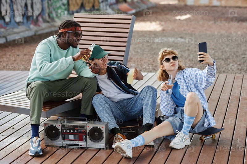 Молодые люди, гуляющие на свежем воздухе с бумбоксом