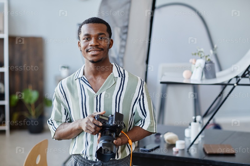 Портрет чернокожего молодого человека с фотокамерой
