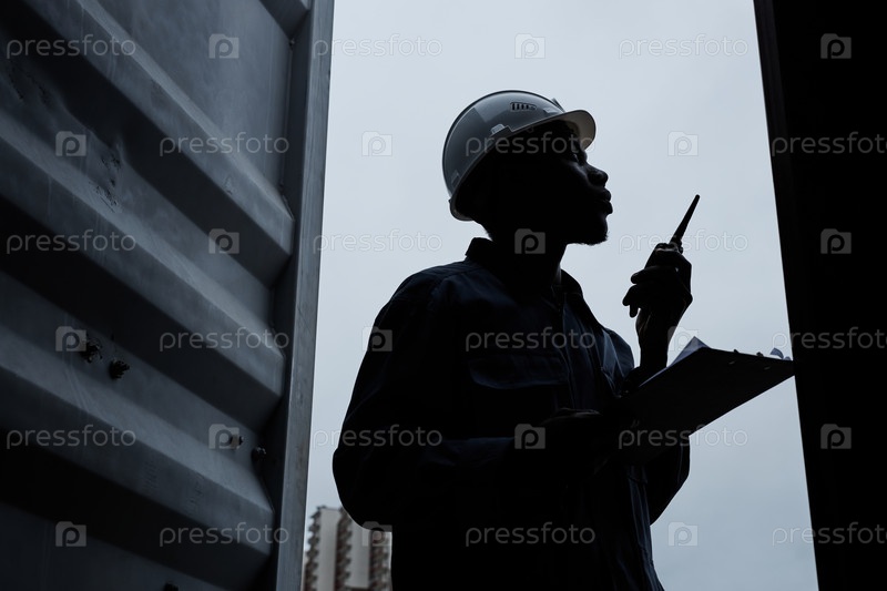 Описание мужского рабочего, стоящего рядом с контейнером в судоходных доках