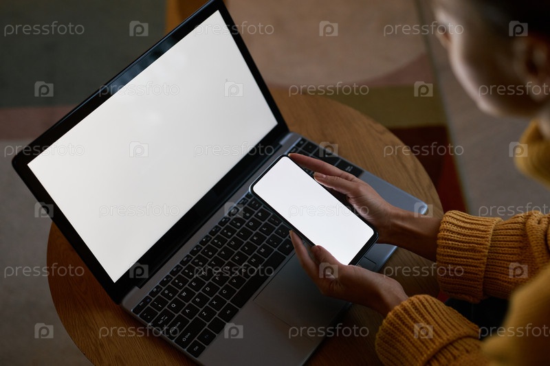 Посмотреть на молодую женщину, использующую ноутбук и телефон с пустыми макетами экрана