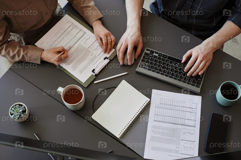 Вид сверху на двух молодых людей за столом заседания, сотрудничающих над ИТ-проектом