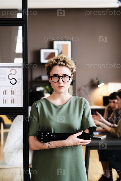Девушка с протезированной рукой работает в офисе