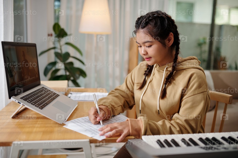 Девочка учится музыкальной нотации