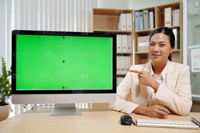 Молодая привлекательная брюнетка, деловая женщина, указывающая на зеленый экран