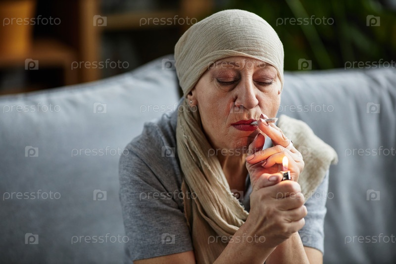 Взрослая лысая женщина зажигает сигарету дома
