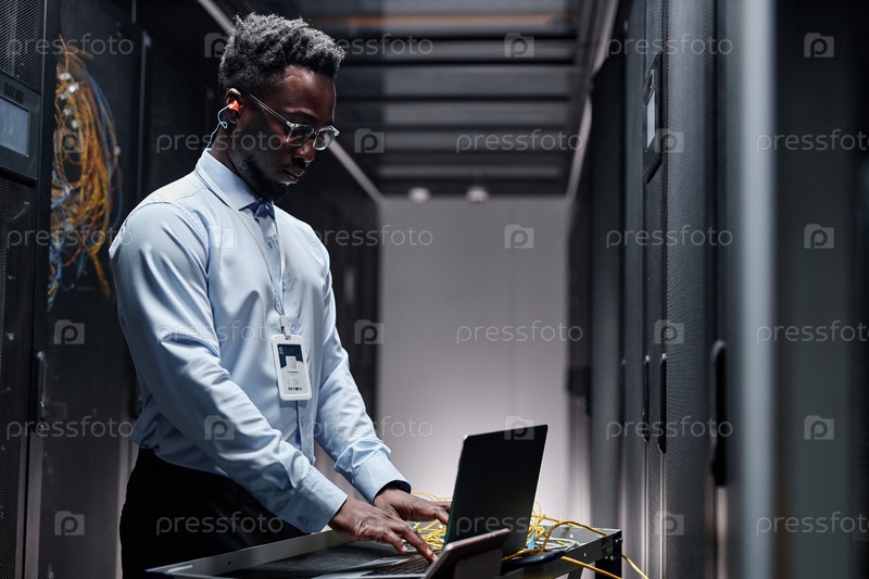 Инженер данных с подсветкой, использующий ноутбук в серверной комнате