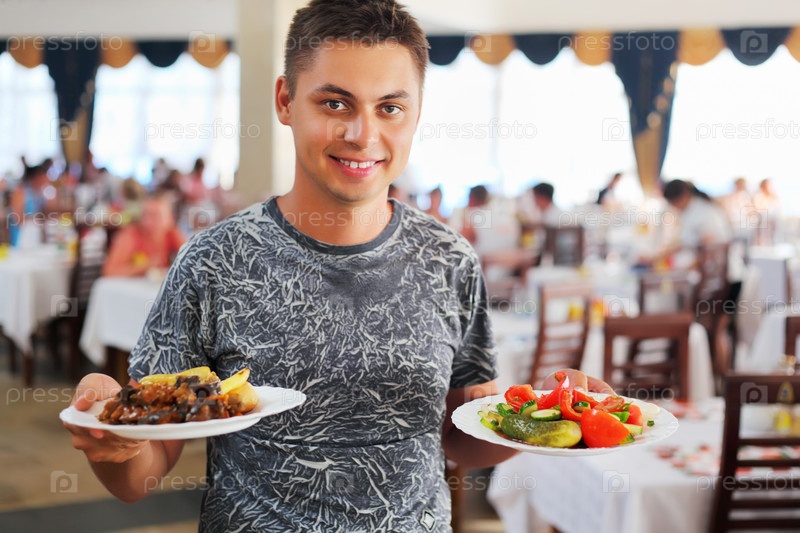 Парень с двумя тарелками в руках