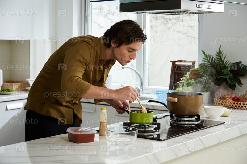 Наслаждаясь приготовлением ужина Человек