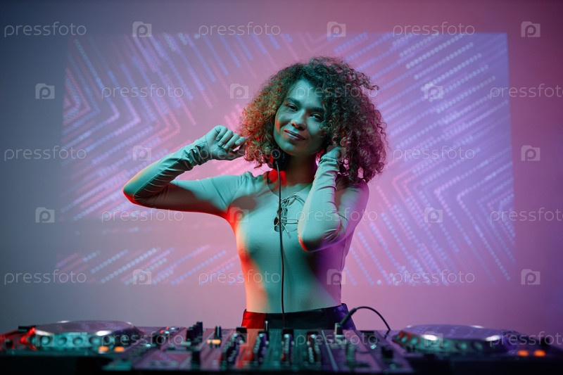 Портрет молодой женщины в качестве женского диджея, смотрящего на камеру