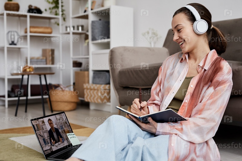 Молодая веселая женщина в наушниках и повседневной одежде слушает своего репетитора