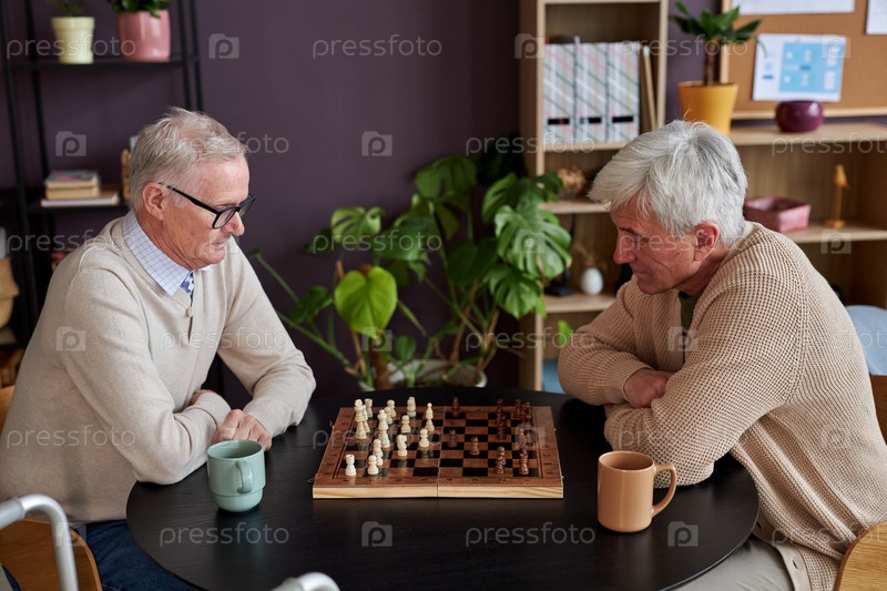 Два пожилых человека играют в шахматы за столом дома престарелых
