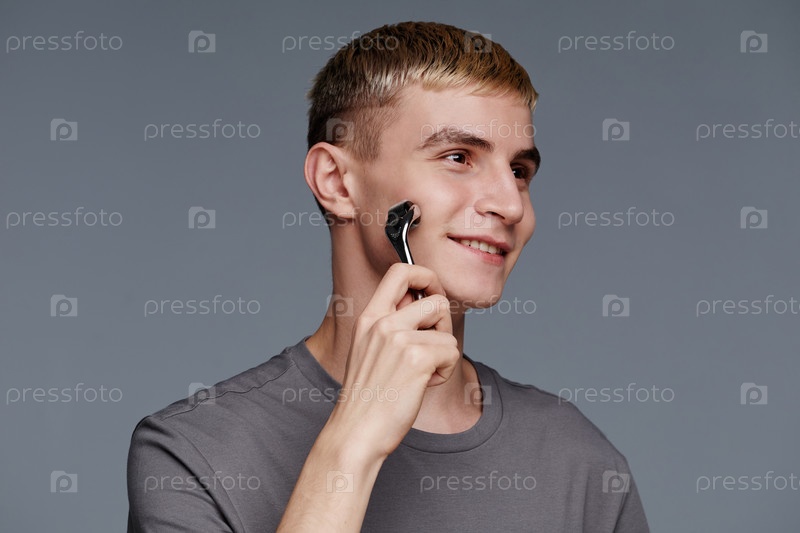Улыбающийся молодой человек делает минимальный уход за кожей