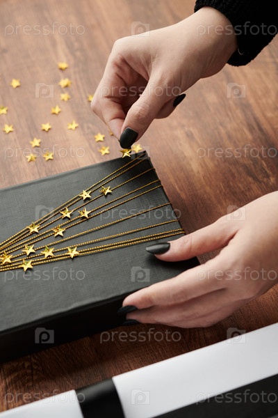 Женщина, украшающая подарочный ящик со звездами