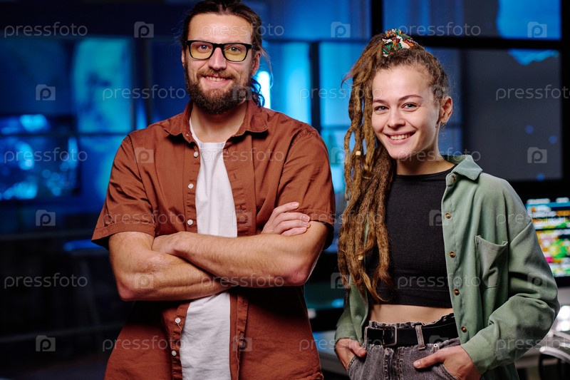 Счастливые молодые мужчины и женщины-инженеры ИТ, стоящие перед камерой