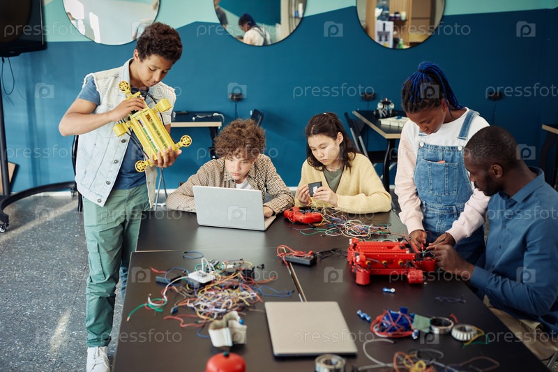 Группа детей в классе инженерии