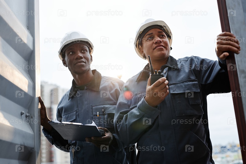 Два работника открывают дверь контейнера