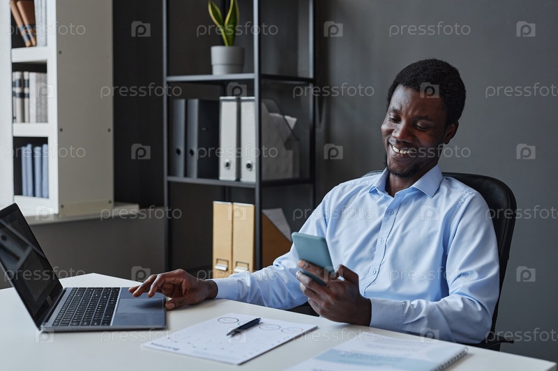 Чернокожий бизнесмен использует смартфон, сидя на столе в офисе