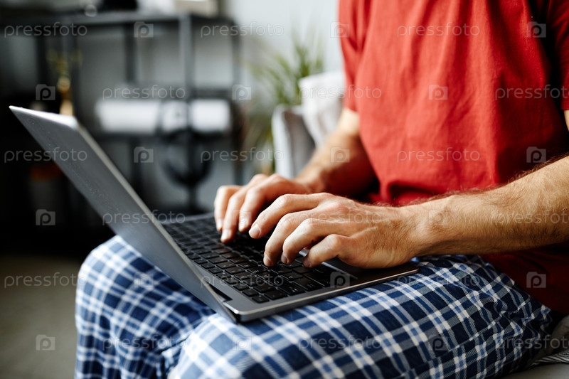 Человек печатает на ноутбуке дома