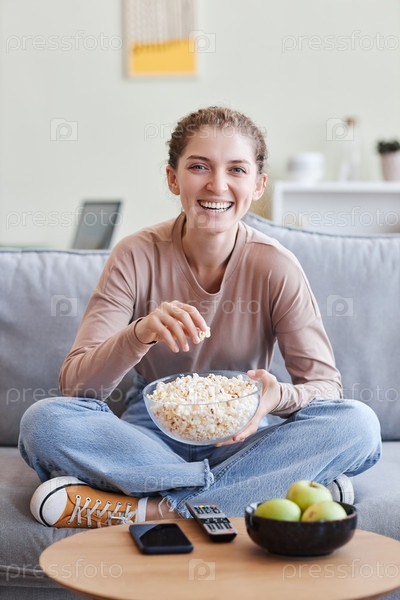 Беспокойная женщина сидит на диване с перекрещенными ногами и держит попкорн