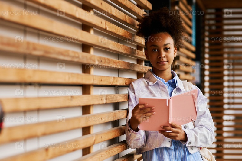 Афроамериканская школьница-подросток с копирайтером в розовой обложке