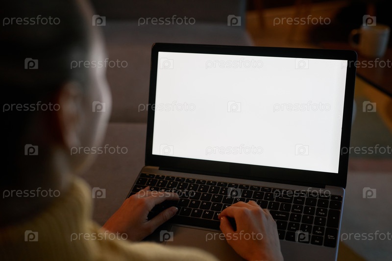 Ближайшее фото женщины, использующей ноутбук с белым экраном в темной домашней обстановке