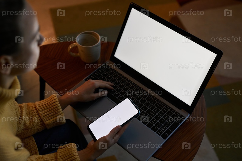 Ближайшее фото молодой женщины, использующей устройства с макетами белого экрана в темной домашней обстановке