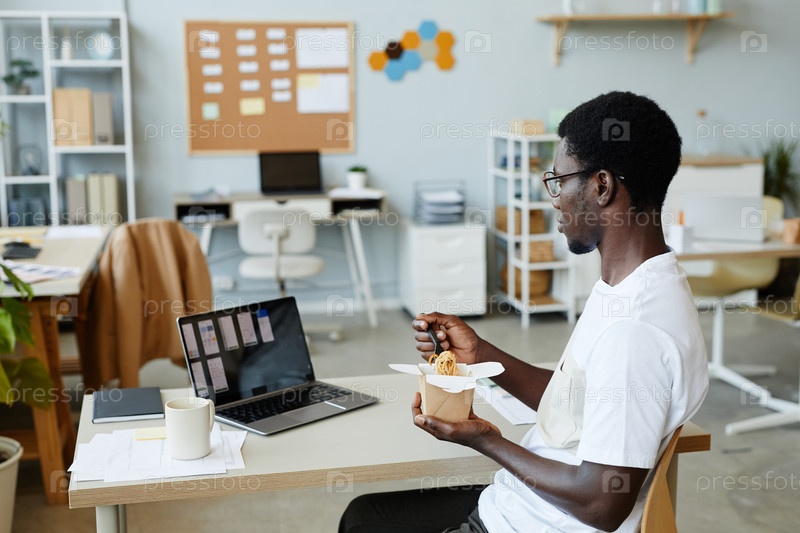 Молодой человек ест вынос на рабочем месте