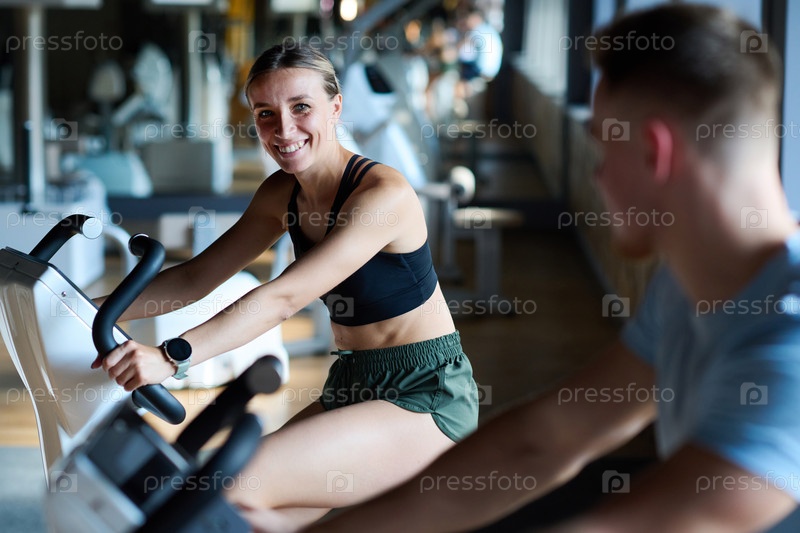 Женщина тренируется вместе со своим бойфрендом в спортзале