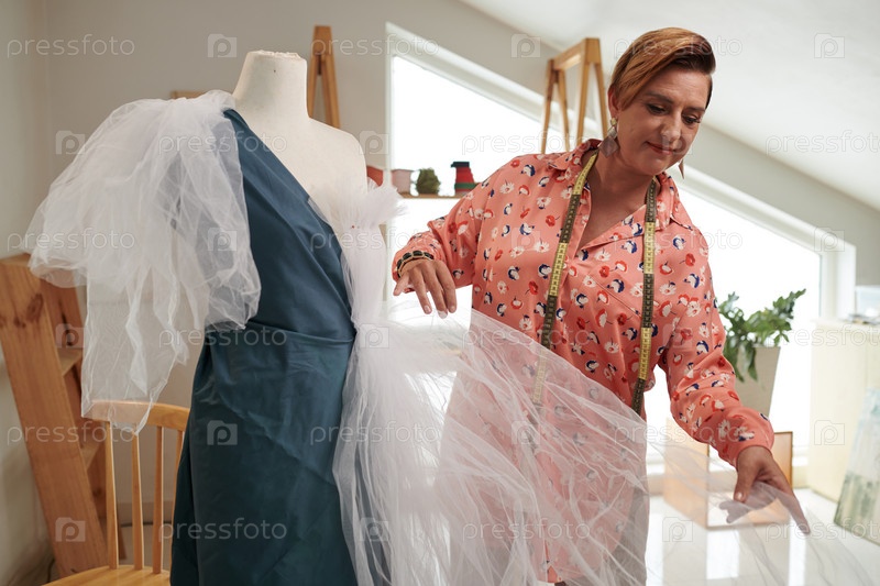 Счастливый модный дизайнер обтягивает тюль на манекен