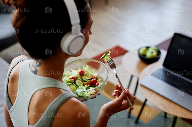 Женщина ест свежий салат, наслаждаясь здоровым образом жизни