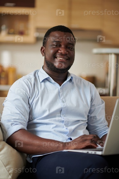 Улыбающийся чернокожий мужчина работает на ноутбуке