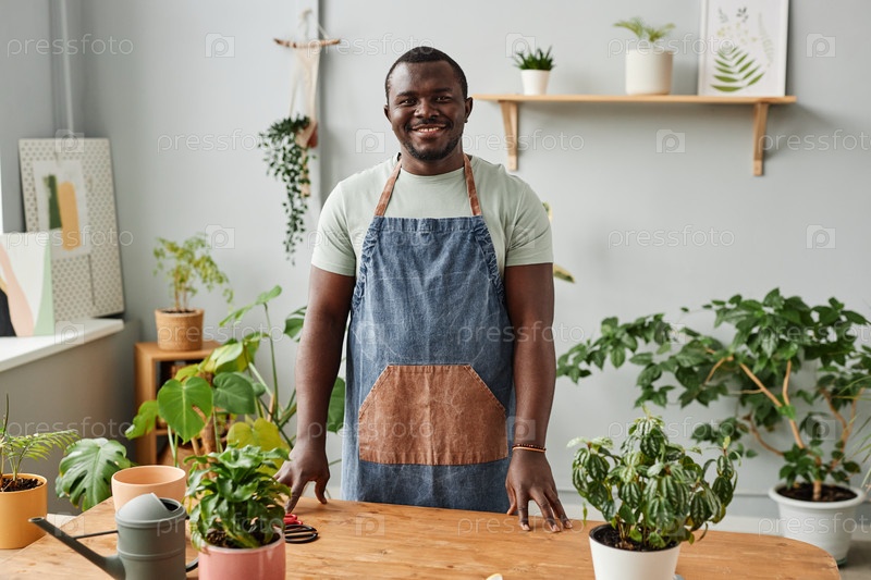 Взрослый чернокожий мужчина позирует с зеленью внутри и смотрит на камеру