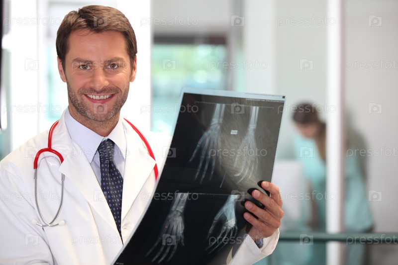 Счастливый доктор смотрит на рентгеновское изображение руки