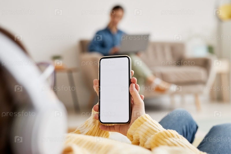 Подростковая девушка держит смартфон с пустым экраном