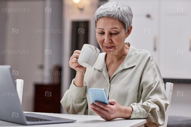 Пожилая женщина использует смартфон на завтрак утром и пьёт кофе