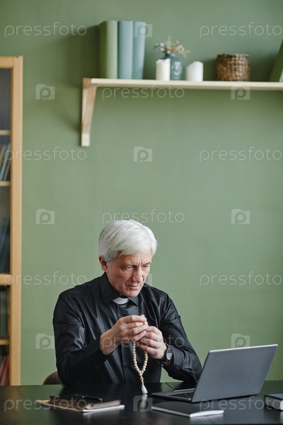 Белокожий старший священник, держащий розарий и молящийся за столом в офисе