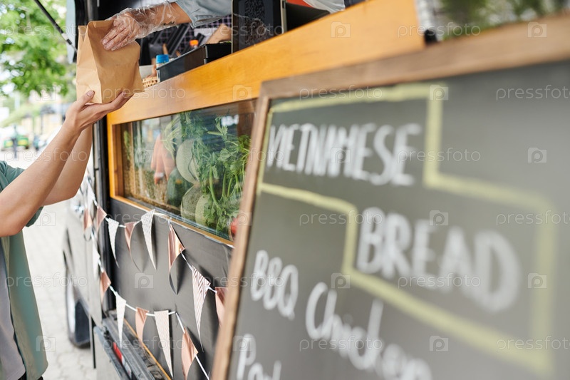 Руки молодого мужского потребителя, берущего бумажные пакеты с гамбургерами