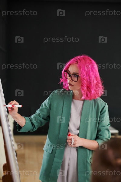Бизнес-тренер пишет на доске