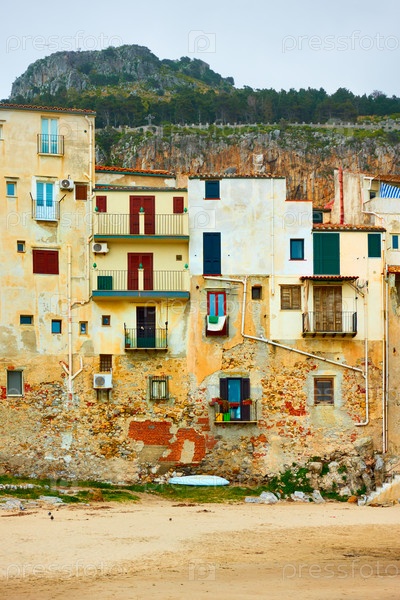 Старые здания на пляже в Чефалу