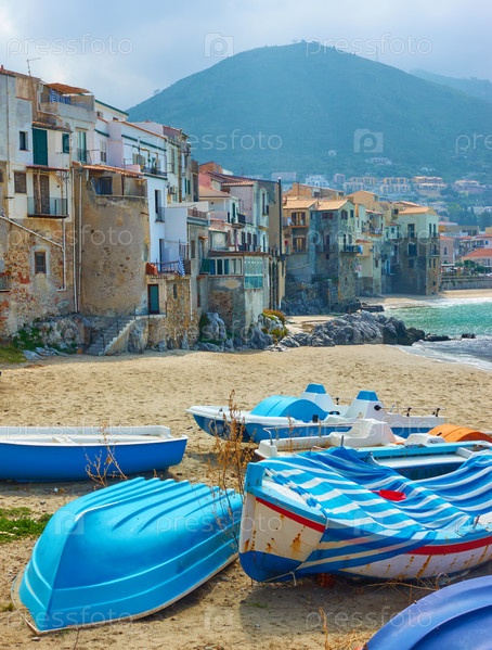 Лодки на песчаном пляже в Чефалу