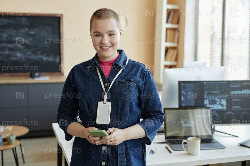 Молодая улыбающаяся деловая женщина использует мобильный телефон и смотрит на камеру