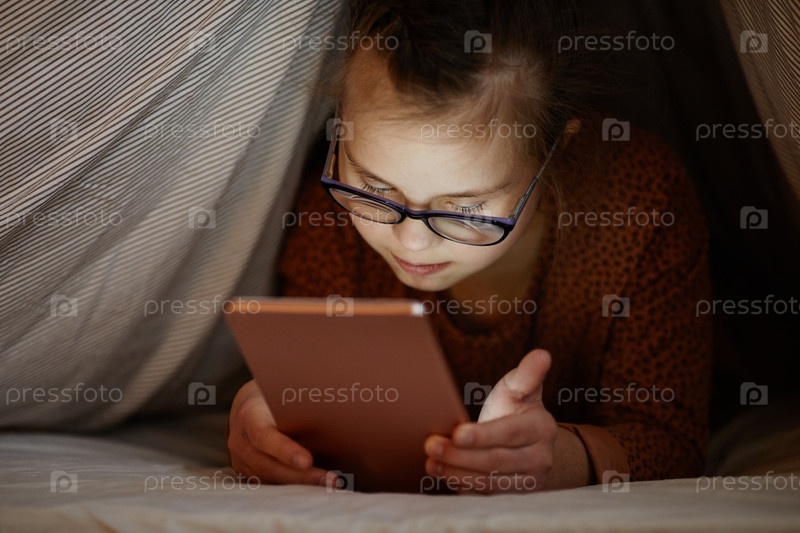 Девушка с синдромом Дауна, использующая смартфон ночью