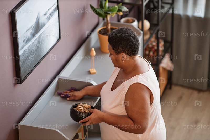 Старшая женщина пылесосит полки