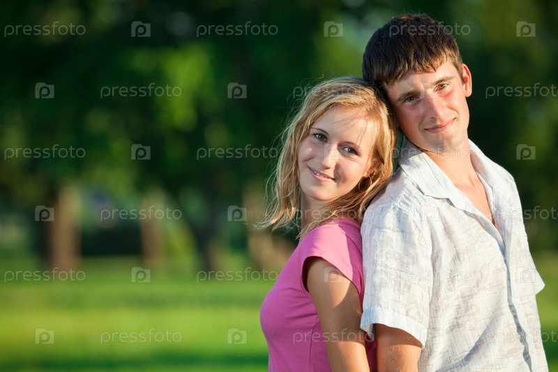 Молодые люди стоят спиной к спине в парке и улыбаются