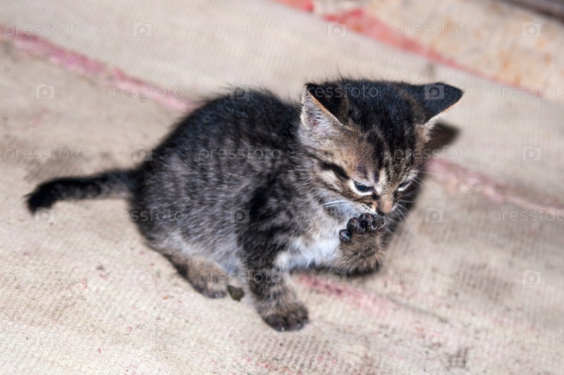 Котенок лижет лапу