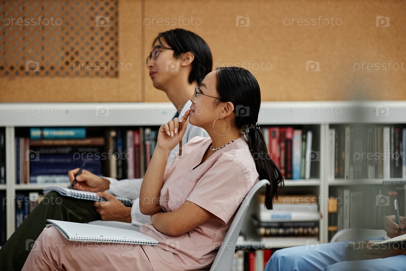 Молодые студенты-медики, сидящие в очереди в аудитории во время лекции или семинара