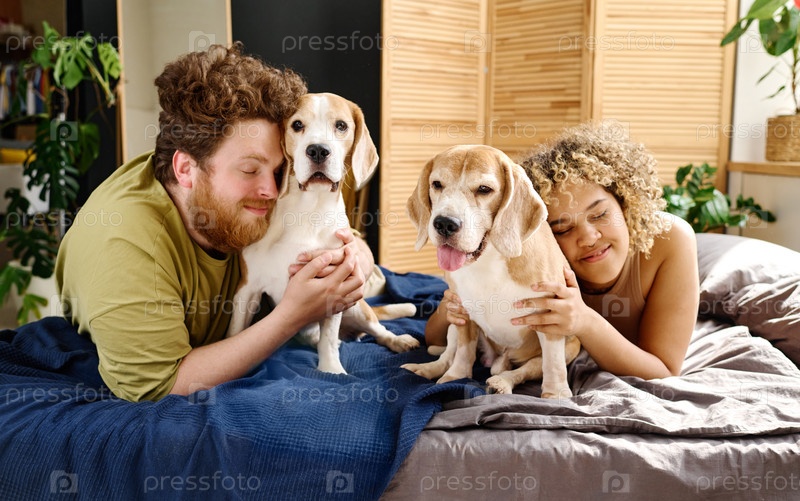 Счастливая семья с собаками в спальне