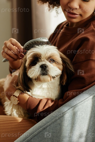Ближайшее изображение маленькой длинношерстной собаки, которая наслаждается уходом за домашним животным и чистится на солнце