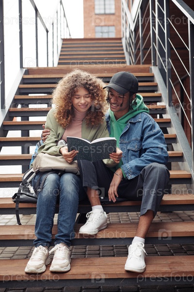 Улыбающаяся подростковая пара в повседневной одежде, просматривающая заметки лекций в копиблоке