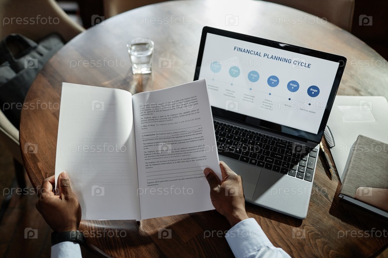 Бизнесмен рассматривает бизнес-контракт в кафе
